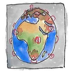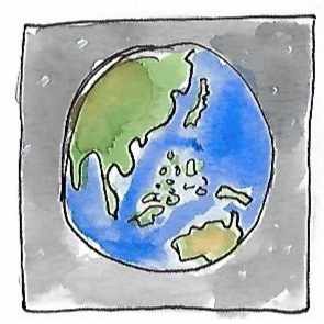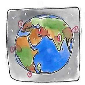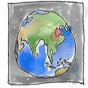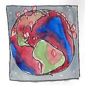 I started by doing a sequence of thumbnails in my sketchbook, a little bit like storyboarding - but as I started I found that these images themselves seemed to work. I used Google Earth as a reference for how the Earth actually looks as it rotates (western maps make Europe disproportionately large) and then added some watercolour in for effect.
