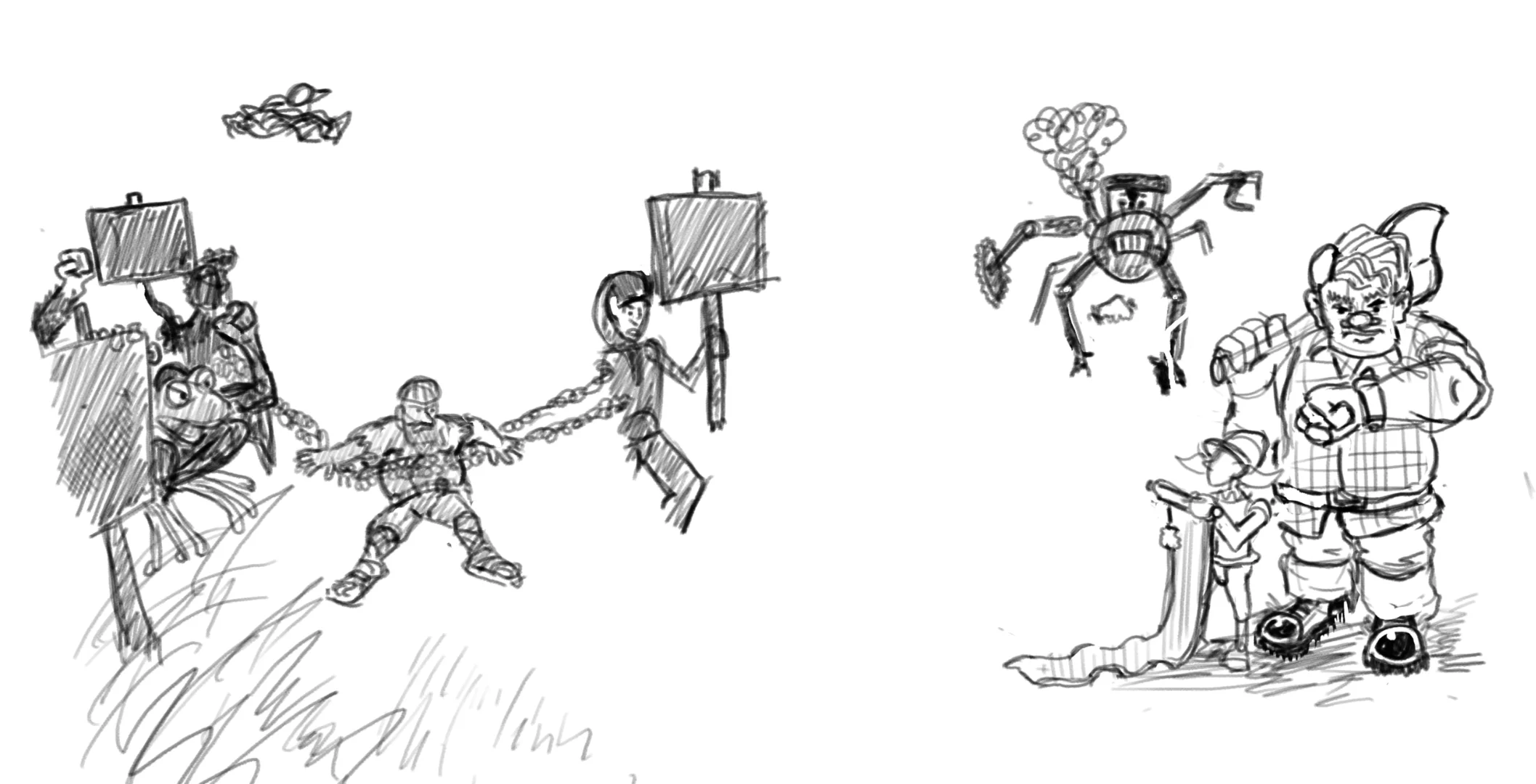 The next illustration describes a community tied to nature. In my head I imagined them as environmental protesters, so created a scene that was an homage to the opening of The Hitchhiker's Guide to the Galaxy, where Arthur Dent lies in front of a bulldozer trying to demolish his house to make way for a bypass. I realised that my thumbnail's proportions were too different from the space allocated for this illustration in the document, so I cut and rearranges the pieces to give myself a new composition and rough layout from which I could sketch.