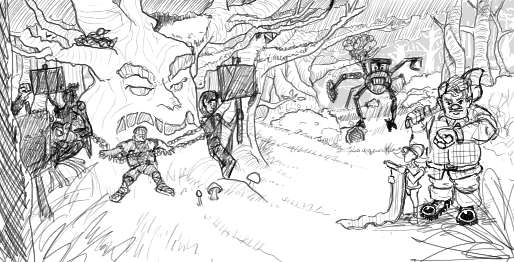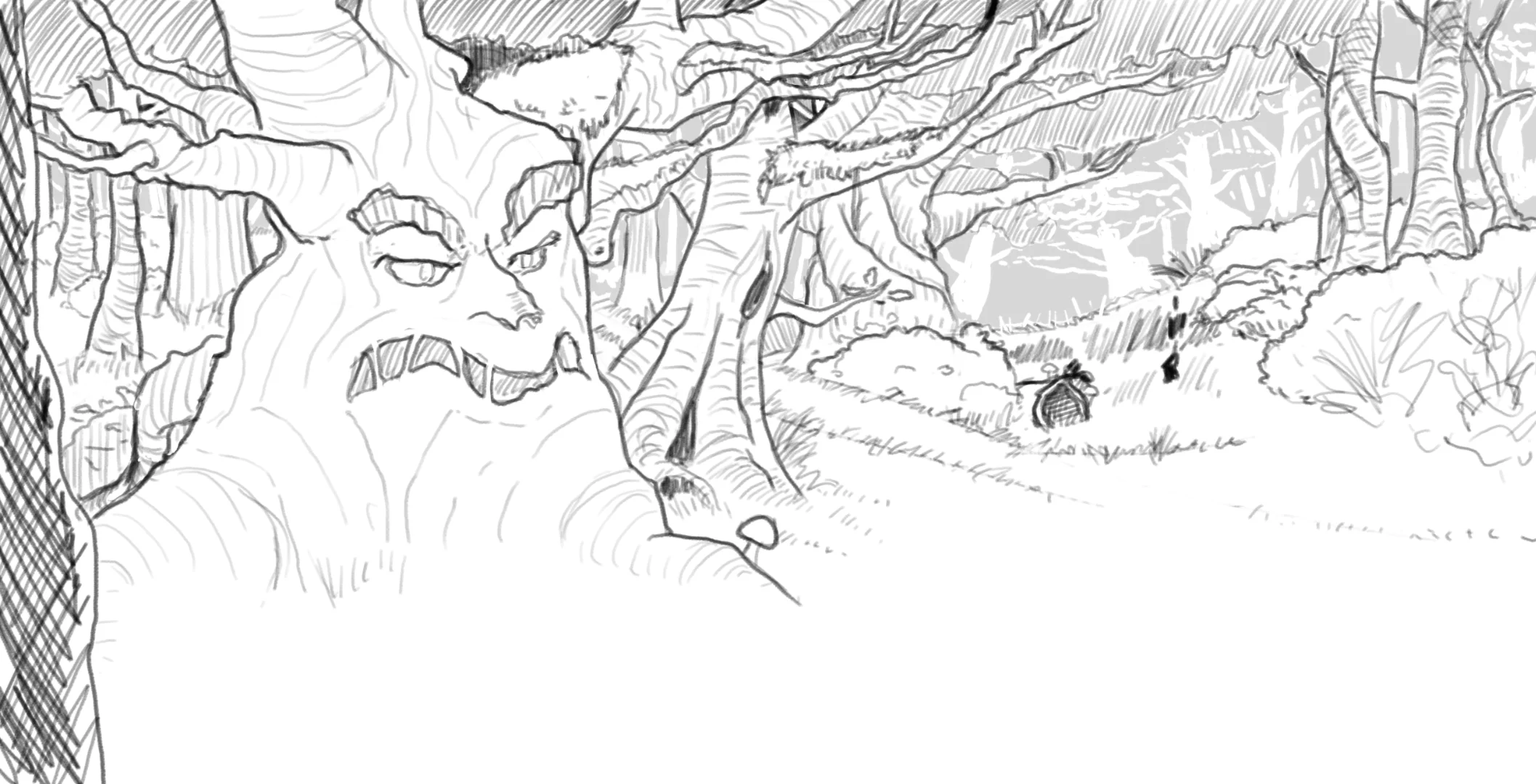 I am pleased with the trees - they feel interesting without being too busy. I reduced the number of foreground characters to make the scene less busy than my thumbnail, and I will use the silhouette of vegetation etc. in the foreground when I complete the final linework.