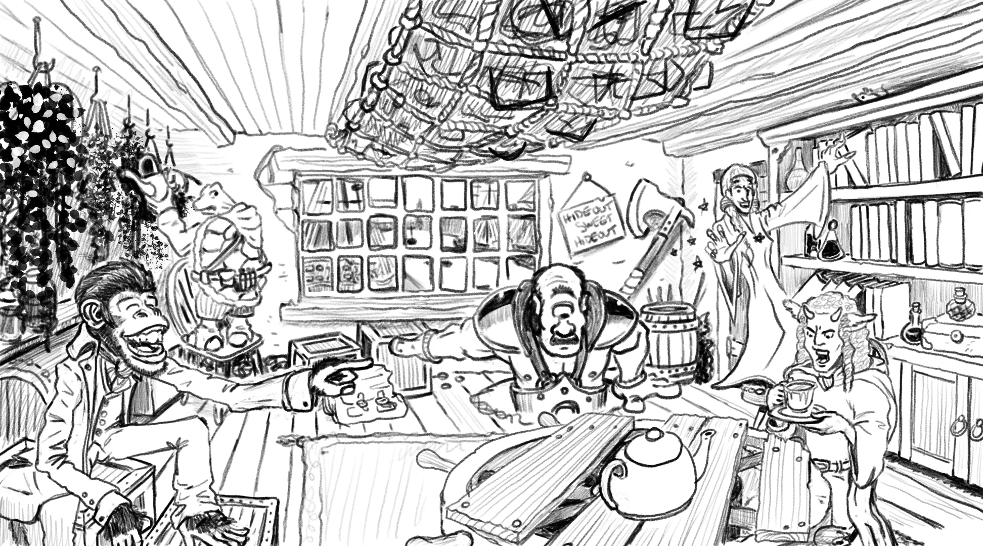 One of the first images I started to develop was a group setting of adventurers from communities that focus on smuggling. I wanted to give the vibe of a dockyard hideout, with a misfit group of loveable rogues. It was also important for me to show how different game classes could be represented from specific communities (it's easy to imagine how a Rogue can be a smuggler, but what about a Druid?).