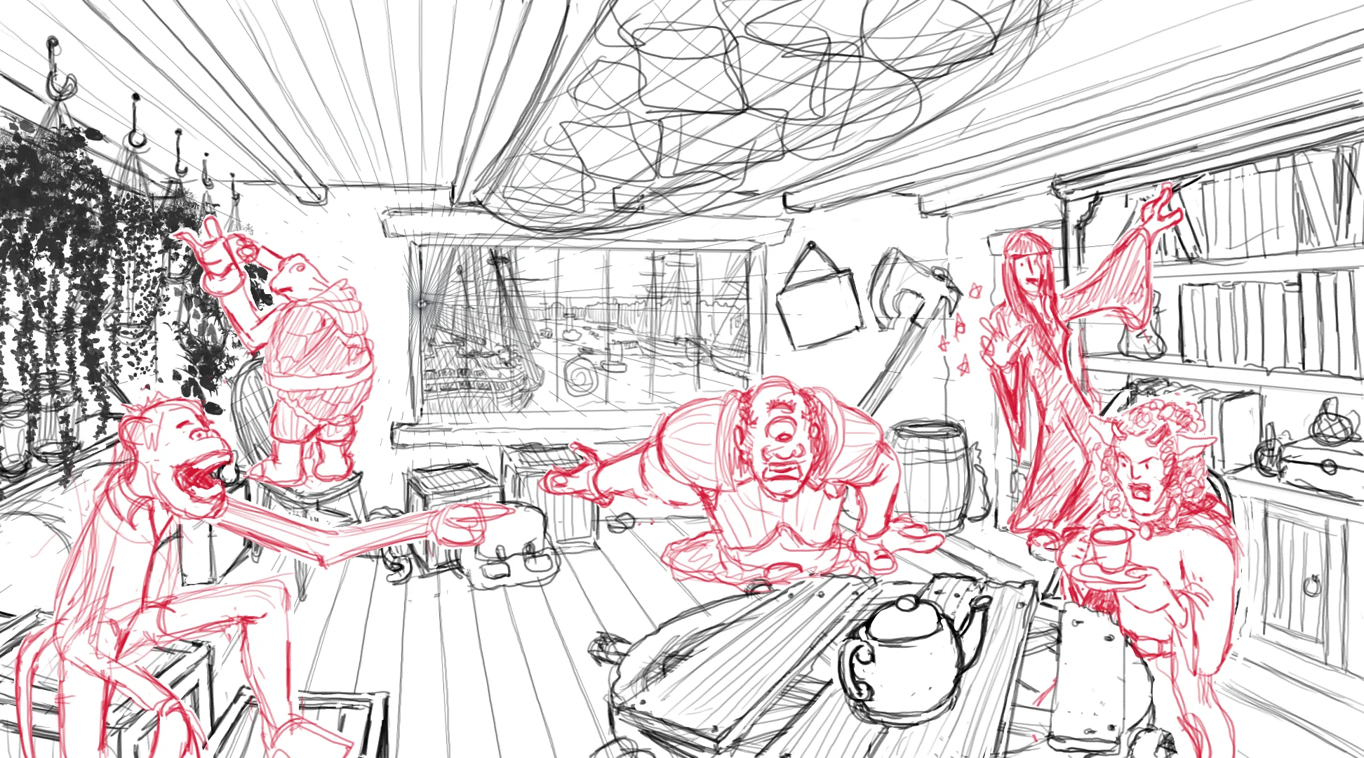 I then used this layout as the basis for my roughs, knocking back their opacity so I could start to sketch in the characters, background, and room items in more detail. This helped me to make choices about what would be in (or out) of the room. I used photo images for the background outside of the window, finding images of tall ships that broadly fit to the perspective I was using, then tweaking where necessary. Trying to draw tall ships from memory was never going to be practical, so this helped a lot. I drew the ships on their own layer, that way if I needed to adjust the perspective or angle, I could move the layer and avoid having to redraw everything.