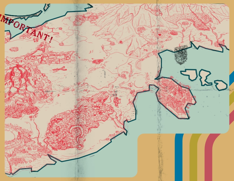 I started to tweak the colours, making the border the same hue as the red, but darker and less saturated. I used a paper texture and stains to give the map a worn and well-used feel.