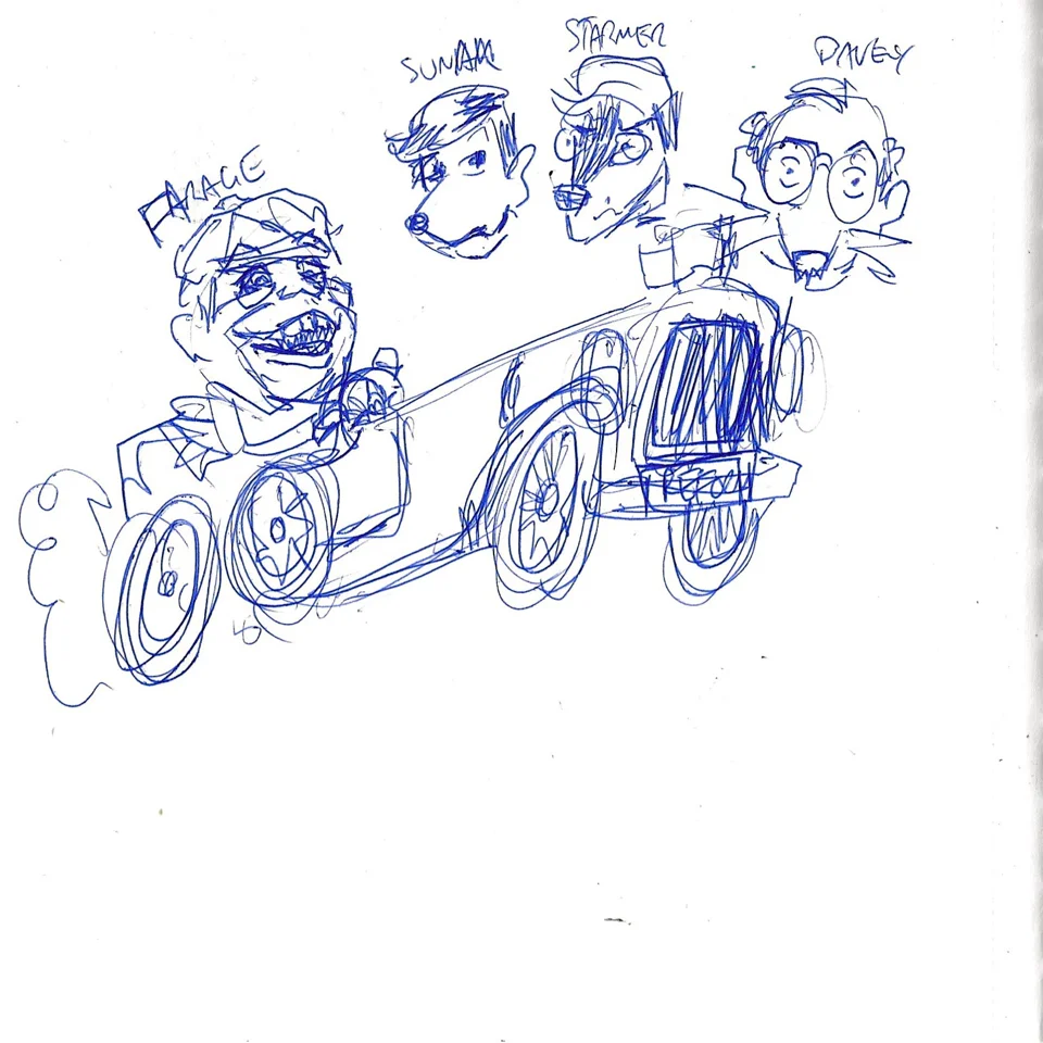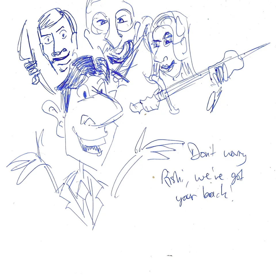 After I had done these sketches my mental and physical health deteriorated, and I did not feel capable of coming back to the exercise for many weeks. All of the delays compounded my poor mental health and exacerbated my ADHD challenges. Some weeks later, the band Oasis had announced their reformation and a new tour. It felt like a subject that people were talking about and ripe for satire. It also felt like less pressure than politics, and built up enough momentum to pick up my sketchbook again and explore an idea that had been building in my head.