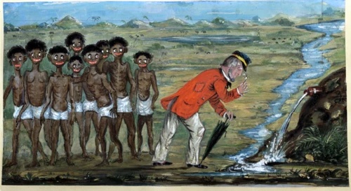 The most prolific colonisation and exploration happened during the 19th and early 20th centuries. Typically images depict the Europeans as more civilised and lordly, that they have natural dominion over the indigenous population. The composition often shows the native peoples presenting to Europeans. The world felt like a much bigger place during this time, and the public at large had a grotesque fascination with other cultures and just how different and 'exotic' they were.
